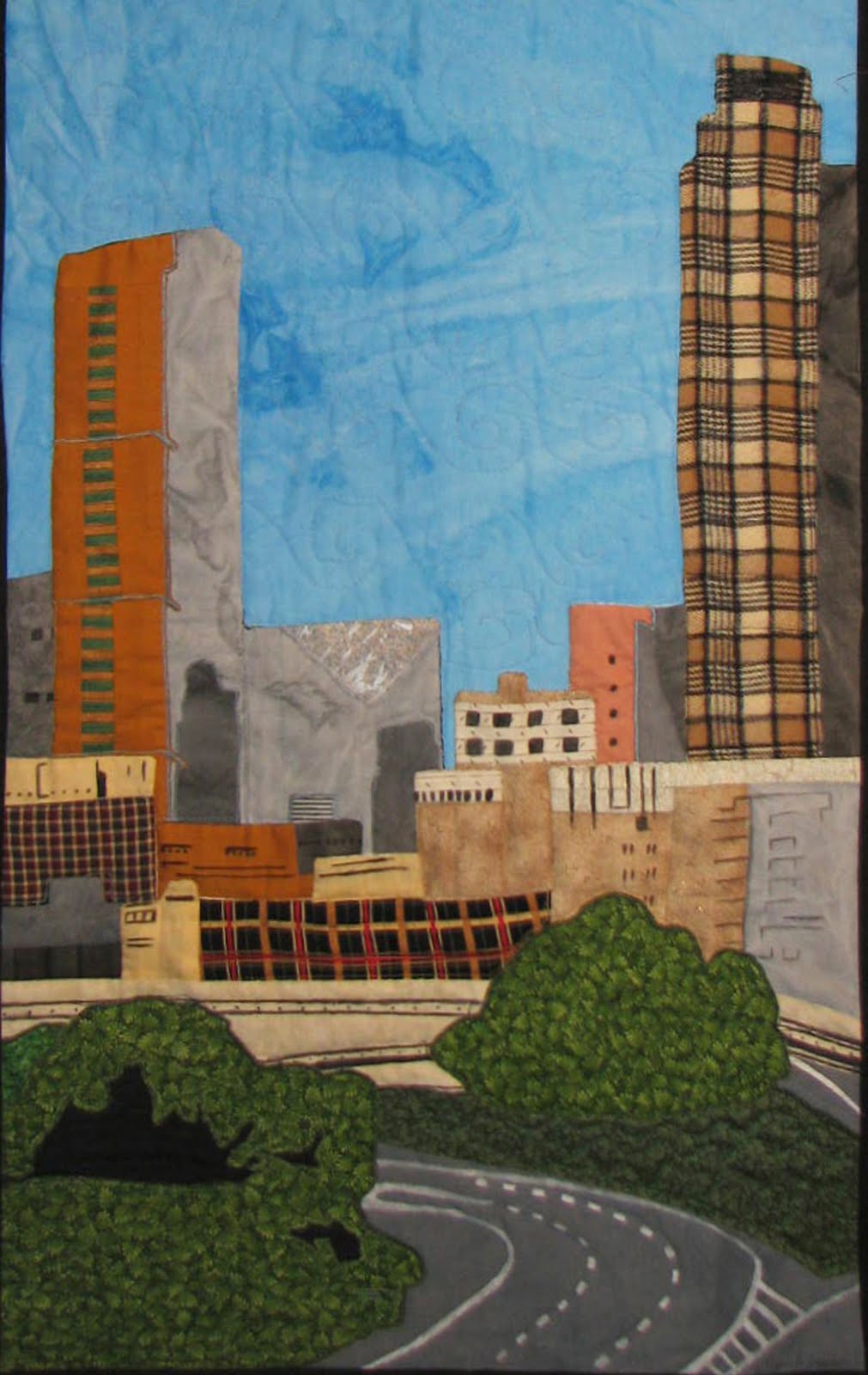 I was overjoyed when Dee asked if I would talk more about the making of this Triptych. At first I thought we would do some kind of landscape picture. Then Elaine mentioned that she would have a better chance with a cityscape. Atlanta was our choice. We went a bridge downtown where we could get a good view of the city and snapped several pictures. Needless to say we visited that bridge several times. I divided the picture into three pieces so that we could choose. It was quickly decided that Elaine would do the middle because her media was so different from mine and Janice’s. Quilting on each end and beading in the middle.