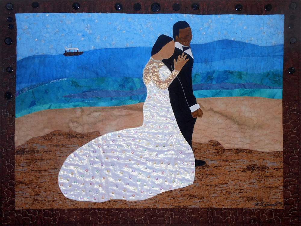 Beach Wedding is an original art quilt designed by Aisha Lumumba. It is a happy couple on the beach after their sharing their nuptials.