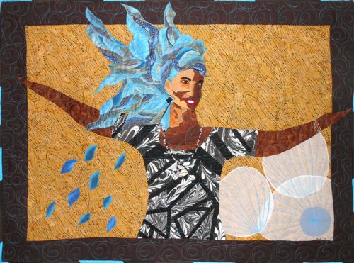 Expect A Miracle is an original art quilt by Aisha Lumumba. It was inspired by a young lady with open arms totally open with great expectations. Applique’ on lovely background fabric highlighted with delicate balls created of soft and delicate sheer fabric. This quilt also includes marbled fabrics created by Marquetta Johnson.