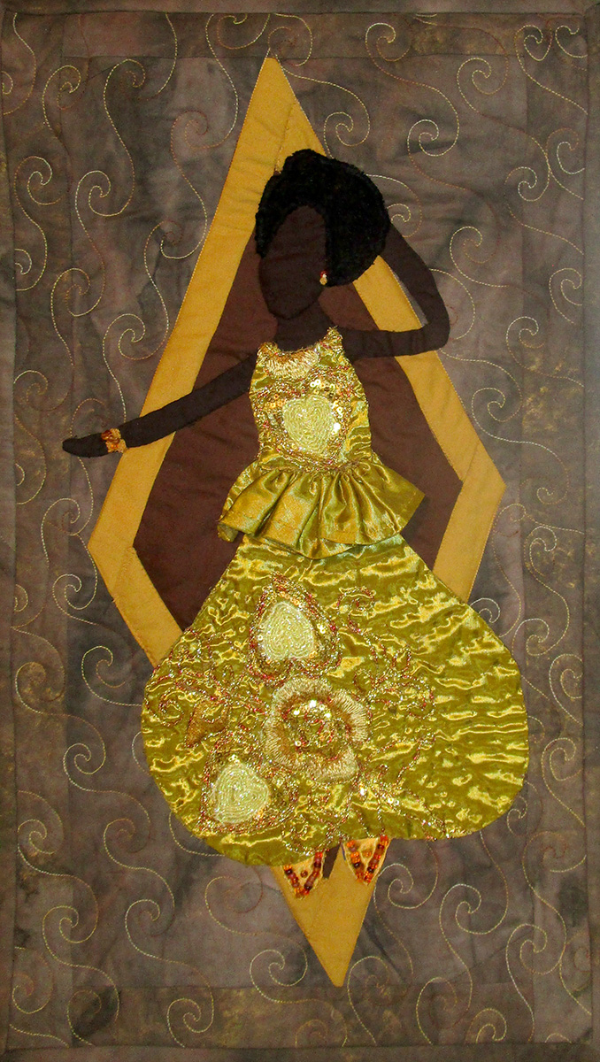 Ms. Goldie is an original art quilt by Aisha Lumumba. This quilt is a woman wearing a lovely gold outfit. She is also wearing matching shoes. The gold and brown background highlights her skin tone and the shimmering dress.