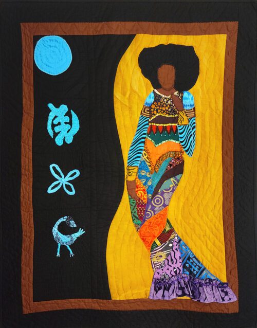 This scrappy quilt pays homage to the blue moon that comes every so often. It also features adinkra symbols.
