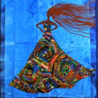 Only Women Have Wings 2-Leap is an original art quilt by Aisha Lumumba. It is number two in the Only Women Have Wings series. This quilt features a silhouette of a dancer leaping over the stress of city life. It was a part of the “The Women Who Fly Exhibit” at the first National African American Quilt Convention in Lawrence, Kansas July 12-16, 2017