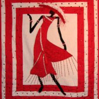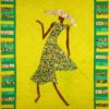 Steppin’ Out #10 is an original art quilt by Aisha Lumumba. It has a lovely piano key border. The woman is wearing a green African print dress on a gold background and is ready to step out. Frames beautifully and makes a great gift.