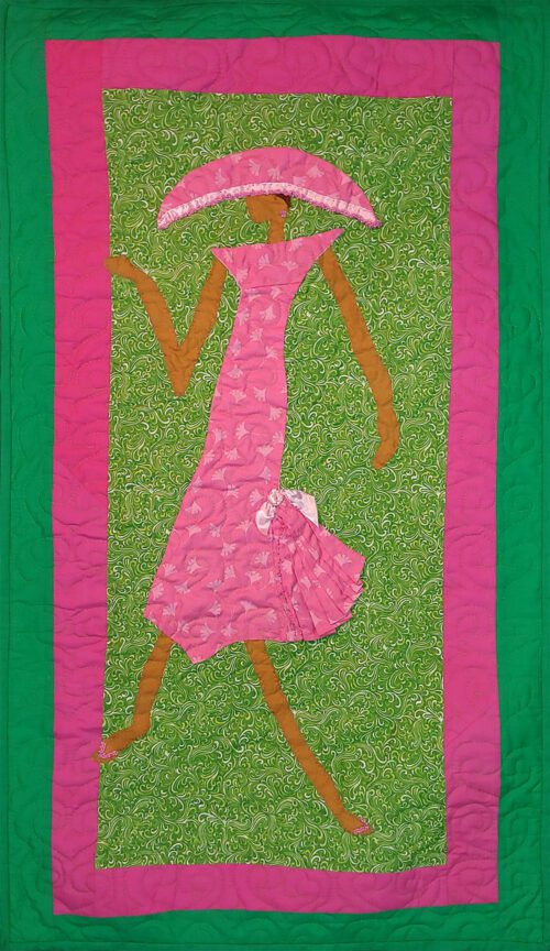 Steppin’ Out #12 is an original art quilt by Aisha Lumumba. This quilt is a lovely lady steppin’ out for the evening and is numbber 12 in the series. It has a green background with a lady wearing a pink dress. It has been loved and admired by many. This quilt is a quilt in my “GET OUT TO VOTE Series”. If you know you know. Great gift.