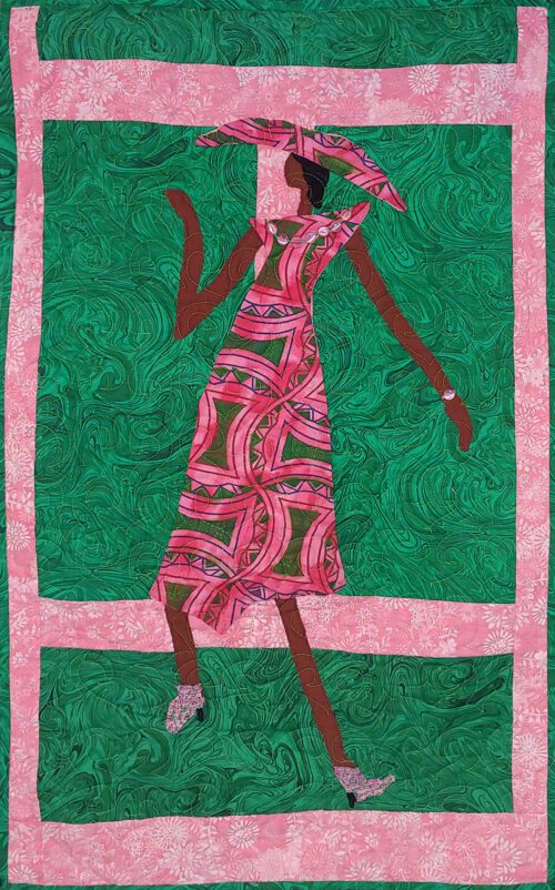 Steppin’ Out #13  is an original art quilt by Aisha Lumumba. This quilt is a lovely lady steppin’ out for the evening and is number 12 in the series. It has a green background with a lady wearing a pink dress. It has been loved and admired by many. This quilt is a quilt in my “GET OUT TO VOTE Series”. If you know you know. Great gift.