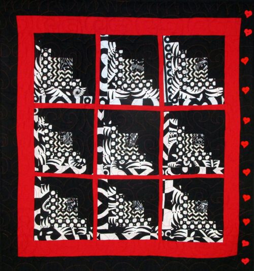 Steps To My Heart is an original log cabin art quilt by Aisha Lumumba. It was inspired by the versatility of the log cabin pattern, so I did it in black and white. Then I used the wonderful little red heart buttons.
