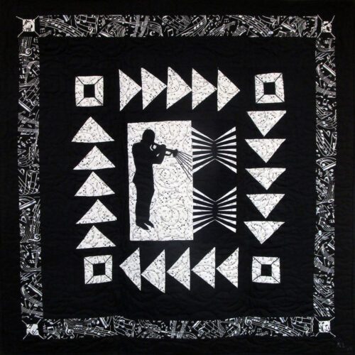 The Trumpeter: Jammin”#3 is an original art quilt by Aisha Lumumba. Like number one and number two, this quilt was inspired by a male trumpet player in a black and white quilt motif. I feel like I can hear the trumpet solo bouncing off the patterns in black and white.
