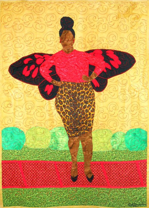 Wait A Minute is an original art quilt by Aisha Lumumba. It is a member of “The Women Who Fly Series” which is also a book of the same title. Wait A Minute is #15 of 2o Quilts in the series. It is a woman taking a long hard look over her life after her husband leaves her with the children. Blind sighted as she wanted to say, “Wait just a d— minute!