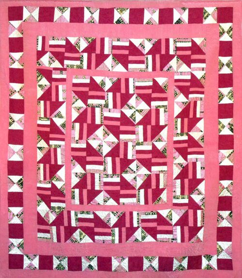 Wine and Roses is a traditional bed quilt by Aisha Lumumba. This quilt is a mixture of rail fence quilt pattern and the pinwheel quilt pattern. It is pink and burgundy and quilted with a rose design.