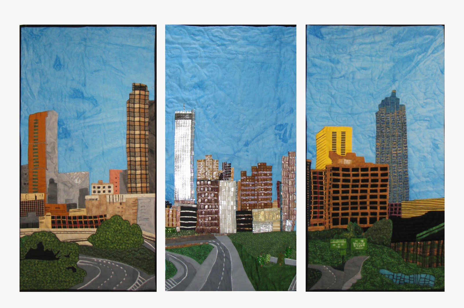 I am so proud of this exhibit. We work very hard to get better every year. I think we did it this year. Elaine, Janice and I created a triptych of the Atlanta skyline. We were all nervous about how it would turn out. Would they match? Could we get the dimensions right? I think it is daunting enough to be one person doing a triptych but to have 3 people working on one was wild. We communicated a lot and worked it out. Tell me what you think. Look close because Elaine’s buildings are made of beads.